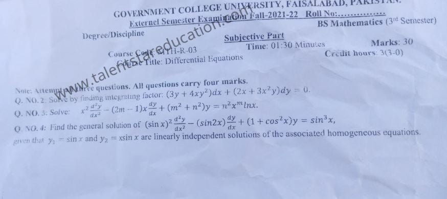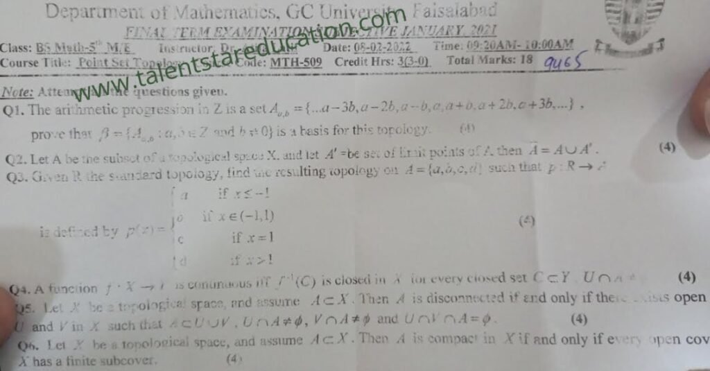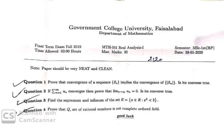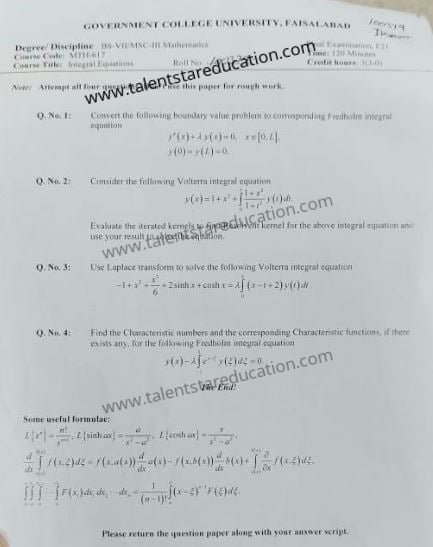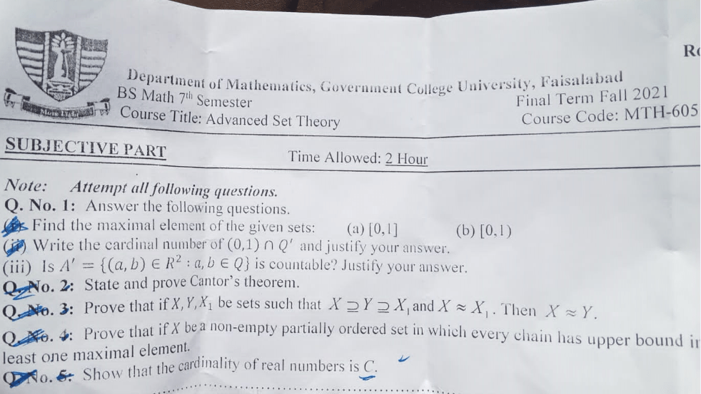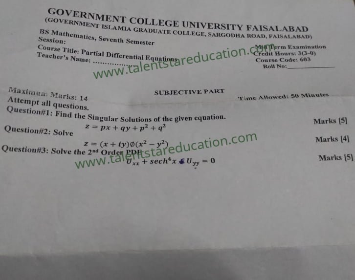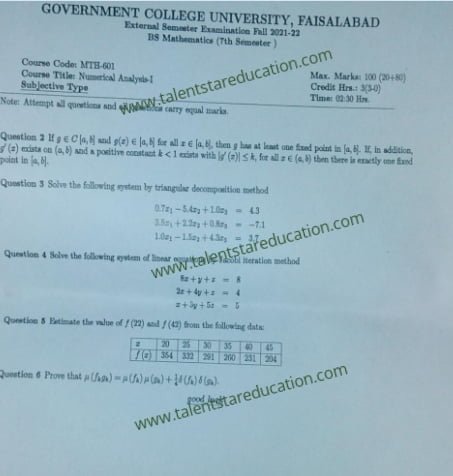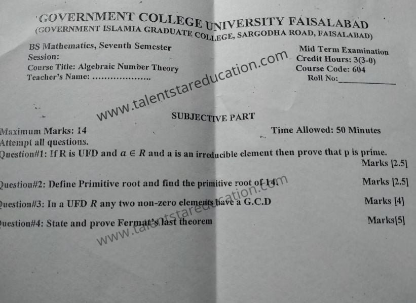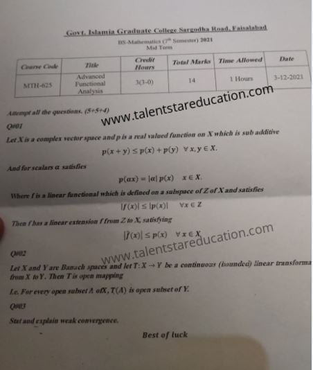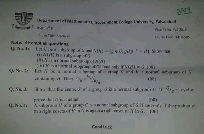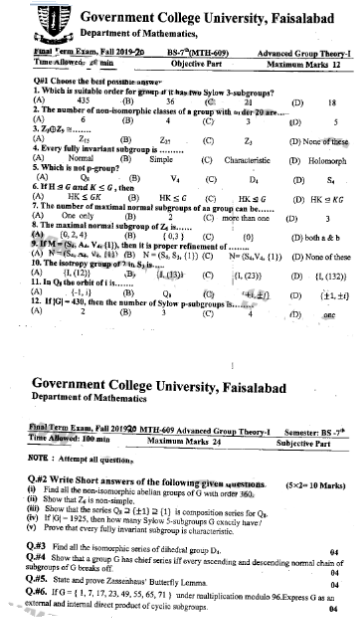 BS. Mathematics GCUF Past Papers for Affiliated Colleges Semester 01 ISL-302 Islamic Studies ENG-321 English-I MTH-301 Calculus-I MTH-303 Mathematical Method-I PHY-325 Physics-I Semester 02 PST-322 Pakistan Studies ENG-322 English-II STT-322 Statistics-I MTH-302 Calculus-II MTH-304 Mathematical Method-II Semester 03 MTH-401 Vector Calculus MTH-403 Mechanics I MTH-407 Communication Skill MTH-407 Number Theory MTH-R-03 Differential Equation MTH-405 Introduction to Computing STT-421 Statistics-II PHY-425 Physics-II Semester 04 MTH-402 Metric and Topological Spaces MTH-404 Differential Equations MTH-406 Numerical Analysis MTH-408 Operations Research CSI-422 C++ Semester 05 MTH-501 Real Analysis I MTH-503 Complex Analysis MTH-505 Vector and Tensor Analysis MTH-507 Algebra-I MTH-509 Point Set Topology Semester 06 MTH-502 Real Analysis-II MTH-504 Algebra-II MTH-506 Mechanics MTH-508 Functional Analysis MTH-510 Differential Geometry Semester 07 MTH-601 Advanced Group Theory MTH-603 Advanced Set Theory MTH-408 Operations Research ​ MTH-603 Partial Differential Equation MTH-617 Linear Algebra MTH-604 Algebraic Number Theory MTH-615 Numerical Analysis-I MTH-605 Mathematical Statistics-I Semester 08 MTH-602 Measure Theory MTH-604 Advanced Functional Analysis MTH-616 Theory of Optimization MTH-612 Numerical Analysis-II MTH-610 Mathematical Statistics-II