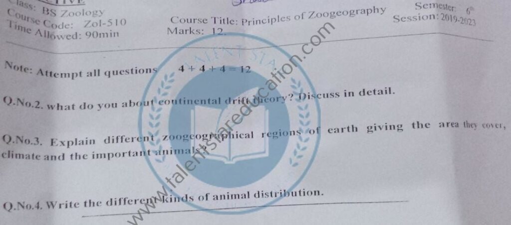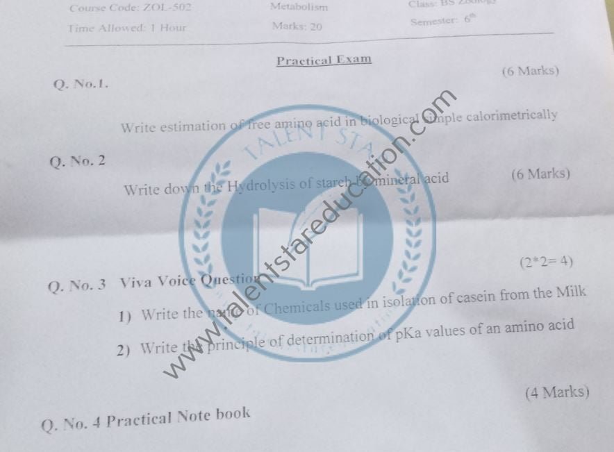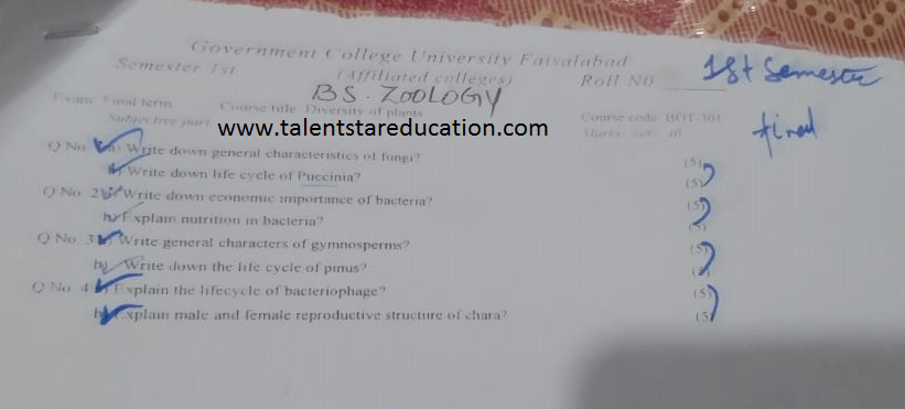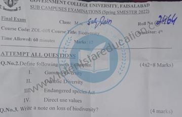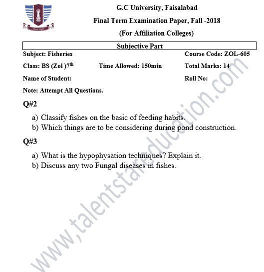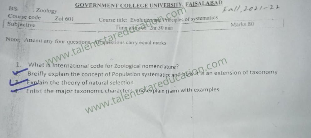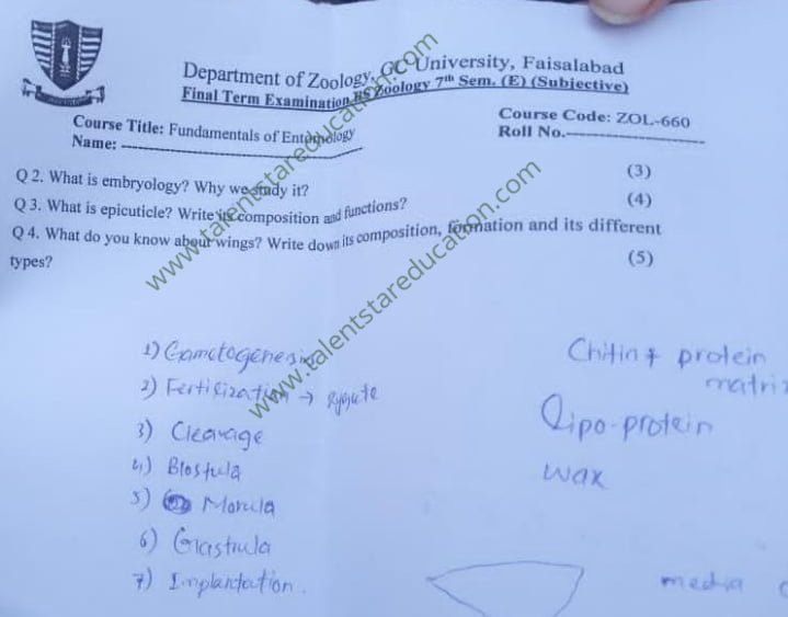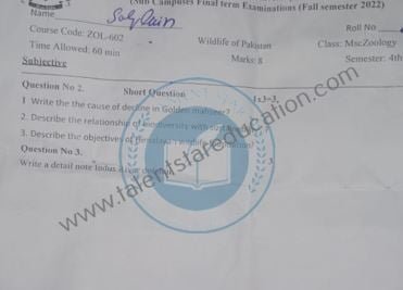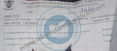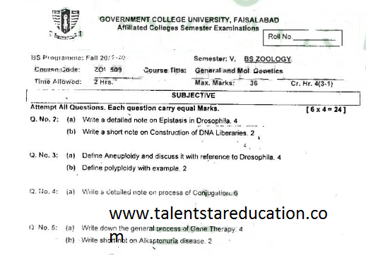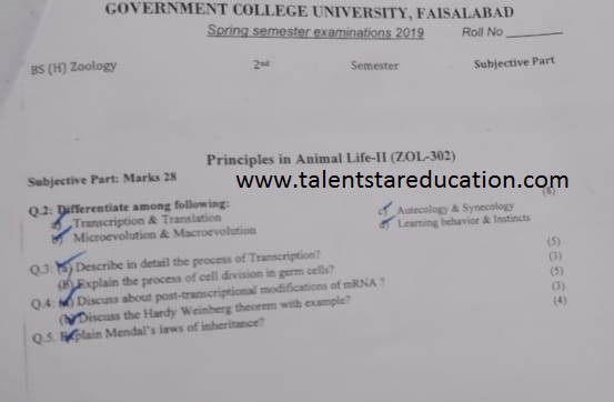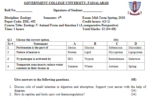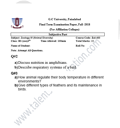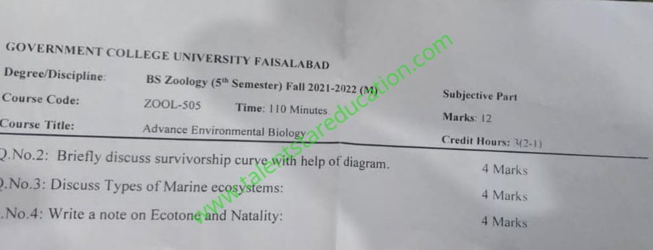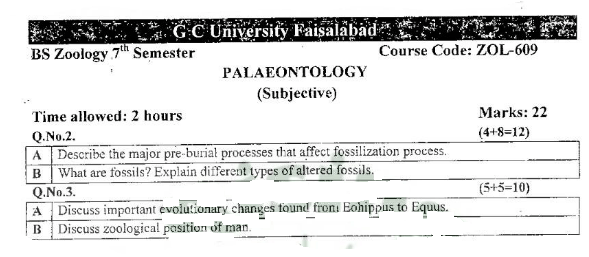 BS. Zoology GCUF Past Papers for Affiliated Colleges Semester 01 ZOL-301 Zoology – I (Principles of Animal Life-I) BOT-301 Diversity of Plants CHM-321 Introductory Chemistry ENG-321 Functional English ISL-321 Islamic Studies/Ethics Semester 02 ZOL-302 Zoology-II (Principles of Animal Life-II) MTH-321 Mathematics-I CHM-322 Inorganic Chemistry – I ENG-322 English Comprehension and Composition PST-322 Pakistan Studies Semester 03 ZOL-401 Zoology-III (Animal Diversity-I: Invertebrates) ZOL-403 Zoology-IV (Animal Diversity-II: Chordates) BOT-302 Systematics, Anatomy and Development CHM-421 Physical Chemistry –I ENG-421 Communication Skills Semester 04 ZOL-402 Zoology-V (Animal Form & Function-I) ZOL-404 Zoology-VI (Animal Form & Function-II) BOT-401 Cell Biology, Genetics and Evolution PSY-422 Introduction to Psychology CSI-422 Introduction to Computer Application Semester 05 ZOL-501 Cell and Molecular Biology ZOL-503 Biochemistry– I (Structure and Functions of Macromolecules) ZOOL-505 Advance Enviromental Biology ZOL-505 Animal Physiology ZOL-507 Animal Behaviour ZOL-509 General and Molecular Genetics Semester 06 ZOL-502 Biostatistics ZOL-506 General and Molecular Genetics MIC-301 Introductory Microbiology ZOL-508 Principles of Zoogeography ZOL-510 Biochemistry – II (Metabolism) ZOL-512 Physiology of Coordination and Animal Behavior Semester 07 ZOL-601 Evolution and Principals of Systematics ZOL-605 Fisheries ZOL-606 Fundamentals of Entomology ZOL-607 Research Methodology ZOL-609 Principles of Paleontology ZOL-656 Aquatic Toxicology Semester 08 BNB-402 Basic Bioinformatics ZOL-606 Wildlife of Pakistan ZOL-608 Bioremediation and Bio-processing ZOL-692 Biodiversity