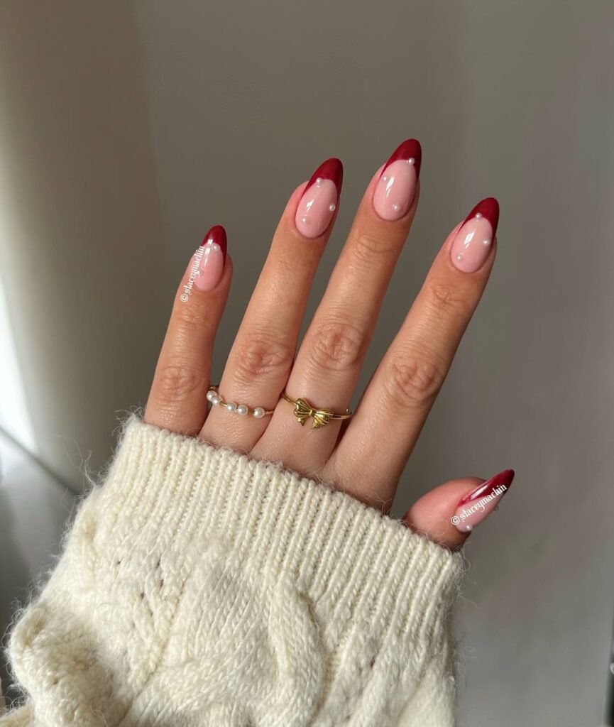 5. Pearl-Accented Christmas French Nails