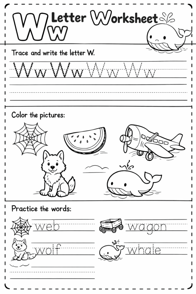 Coloring worksheets combine creativity with learning. Children color pictures of W-themed objects while visually reinforcing the letter shape and sound.
